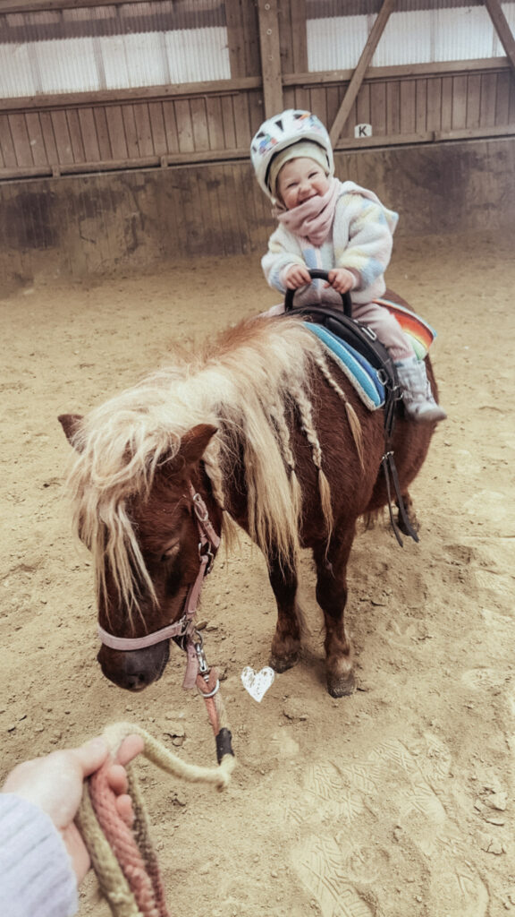 Durch spielerisches Heranführen an brave Ponys mit kuscheln, schmusen, putzen, führen und sitzen auf dem Ponyrücken, werden die Kinder auf späteres Reiten und Reitstunden vorbereitet.